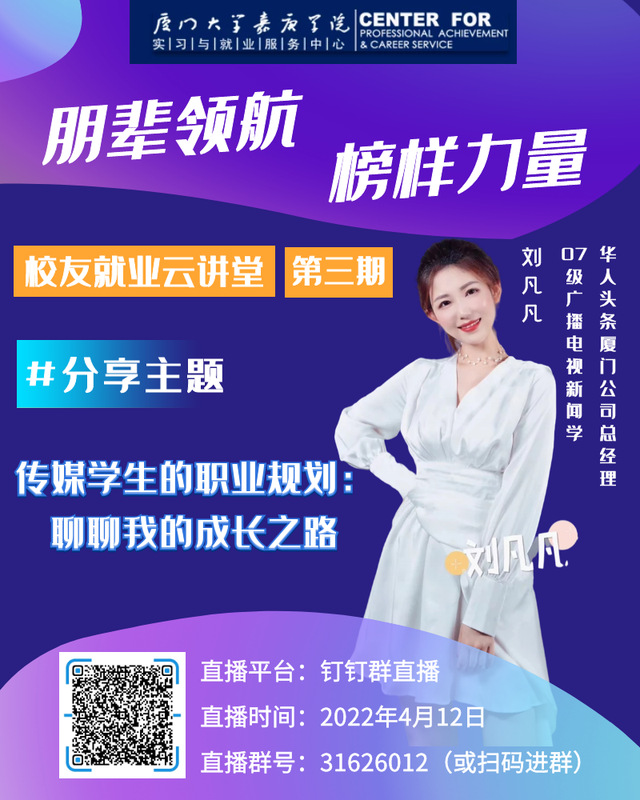近期,国内疫情多点散发,对今年高校毕业生求职带来不利的影响。为积极应对形势变化,自3月起,实习与就业服务中心将面向广大嘉庚学子举办“朋辈领航,榜样力量”之校友就业云讲堂就业指导系列讲座。在这里,我们将与许多校友相遇,了解更多行业、更多领域的职业生活。
