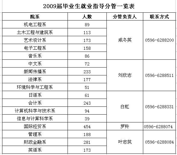 2009届毕业生就业指导分管一览表