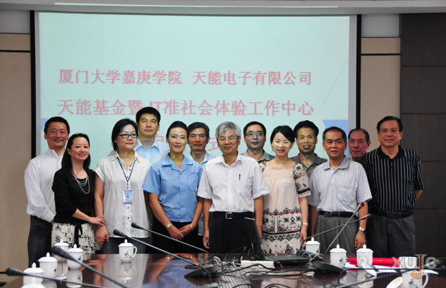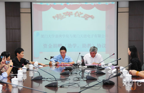 昨天,厦门天能电子有限公司总经理吴惠芳等一行人专程来到我院,与我院签订资金捐赠(助学、助教)框架协议,同时正式启动JT准社会体验工作中心的工作。根据协议,厦门天能电子有限公司将每年出资20万用于JT准社会体验工作中心的运营和管理,定向资助嘉庚学院的教研发展及教师培训、学术进修,以及定向资助学生开展学术活动和举办各类讲座。
