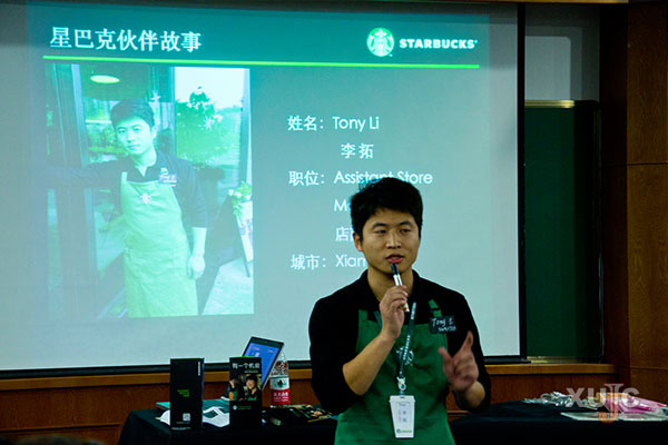 12月6日,星巴克在我院公共教学楼1号楼208进行了校园招聘会,星巴克咖啡华南市场的区经理Mike和营运经理James前来宣讲。招聘会现场挤满了学生,除了毕业生外,众多大一、大二、大三的学生也前来聆听,不少人还是站着的。