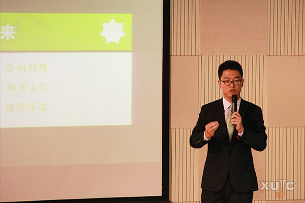 “你现在就可以直接到我们公司上班,我们要保持联系。”盛世纵横投资管理有限公司CEO张杨杨对我院学子李辰宇说,现场观众报以热烈的掌声。