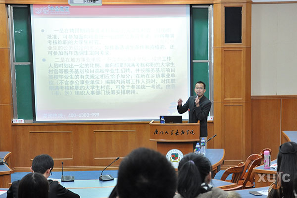 12月5日晚上7点,厦门中公教育资深讲师徐翔在人文大楼B301室为我院学子讲解大学生村官备考技巧。讲座围绕为什么考村官、如何备考和村官考试考什么三个方面进行。