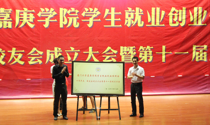 大会的最后,叶志筑老师与刘钊学长共同为学生就业创业促进会揭幕。这次大会,在对学促会过去十年回首的同时,更是让刚加入学促会大家庭的新成员们对学促会有了更深的了解,也更加明白自己所肩负的希冀和责任。最后,厦门大学嘉庚学院学生就业创业促进会十周年庆、校友会成立大会暨第十一届成立大会在校友们的阵阵掌声中落下了帷幕。