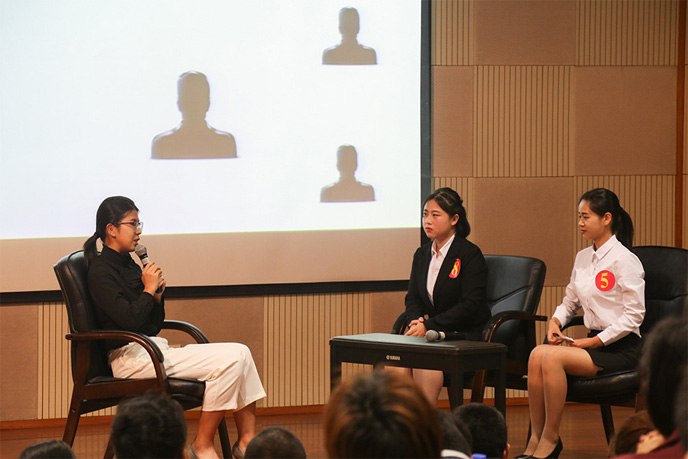 “以一敌二”的角逐像一场小型辩论赛,即在指定的4分钟时间里,3名选手一组,分别围绕各自的职业规划,轮流质问和回答。选手唇枪舌战,你来我往,现场局面一度胶着。该环节,李睿琳表现出色,其鲜明的个性及台风给评委和观众留下了深刻的印象。当被其他选手质疑想从事的职业与就读专业不对口时,她认为机遇与挑战是并存的,个人认知不应局限于年龄、专业等因素。