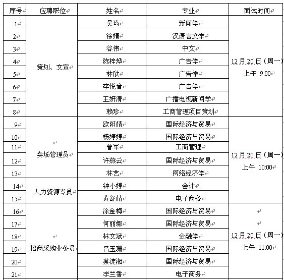 天虹商场股份有限公司2010年12月15日在厦门大学嘉庚学院进行的校园专场招聘会,通过简历筛选,现将进入第一轮面试的名单公告如下: