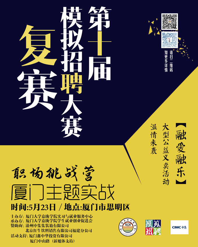 主办单位:厦门大学嘉庚学院实习与就业服务中心承办单位:厦门大学嘉庚学院学生就业创业促进会活动支持:厦门鑫中华投资有限公司、厦门中山路(新媒体支持)
