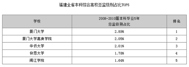 晋升能力领跑榜单 毕业生在毕业五年的晋升情况是反映高校人才培养质量的重要指标,在《福建省本科高校毕业生竞争力报告之晋升调查》中,嘉庚学子以优秀的综合能力及广阔的晋升空间领跑榜单。在“全省本科独立院校及民办类高校总监级别占比”排名中,我校以2.05%的成绩位列第一,占比均值甚至高于全省本科工科类高校。 同时,在“福建全省本科综合高校总监级别占比”排名中,我校打败了华侨大学等省内重点院校,位列第二名,排名仅次于厦门大学。由此可以看出,嘉庚学院毕业生在实践能力、管理能力、创新能力等方面位于省内高校毕业生前列。