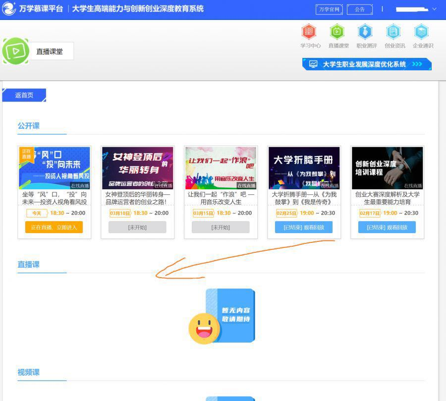 在浏览器输入https://mooc.wanxue.cn,点击“开始学习”,如果已有账号,点击“登录”,没有请点击注册。点击右上角直播课堂/专属课程页面,进入直播课列表,在直播列表窗口找到相应课程名称,显示“正在直播”的课程,点击进入即可。