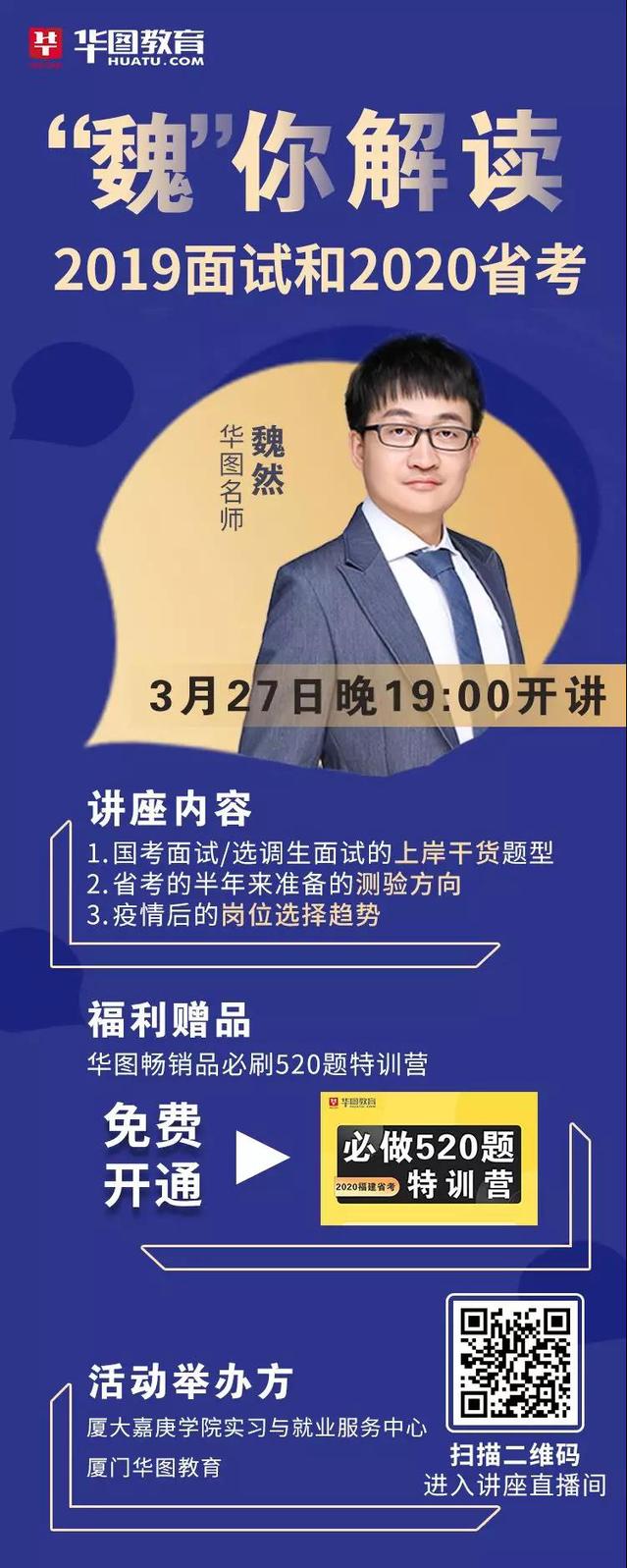 时间:2020年3月27日(周六)19:00 参与方式:扫描二维码进直播间 针对群体:有意参加公职类考试的全体在校生 主题要点: 1. 国考面试、选调生面试的上岸干货题型 2. 省考的测验方向 3. 疫情后的岗位选择趋势