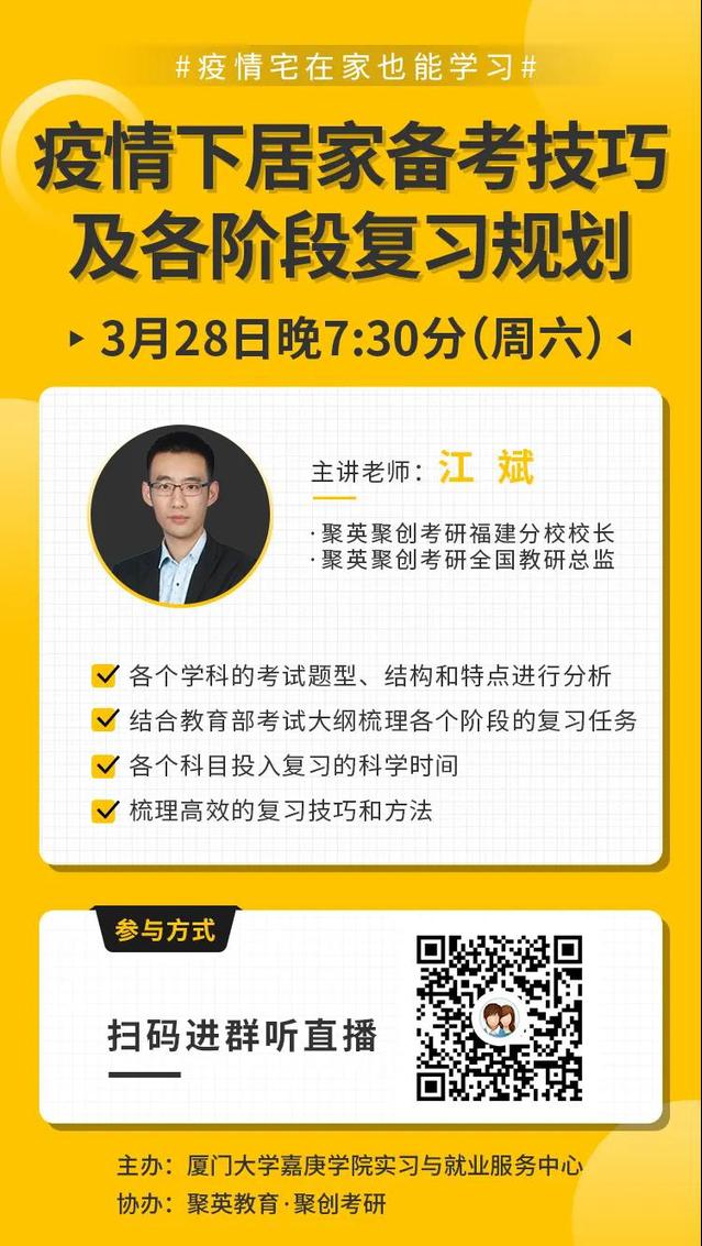 时间:2020年3月28日(周六)19:30 参与方式:扫描二维码进群 主讲人简介: 江斌,聚英聚创考研福建分校校长,全国教研总监。 针对群体:有意参加考研的全体在校生 主题要点: 1. 各个学科的考试题型、结构和特点分析 2. 结合教育部考试大纲梳理各个阶段的复习任务 3. 各个科目投入复习的科学时间 4. 梳理高效的复习技巧和方法