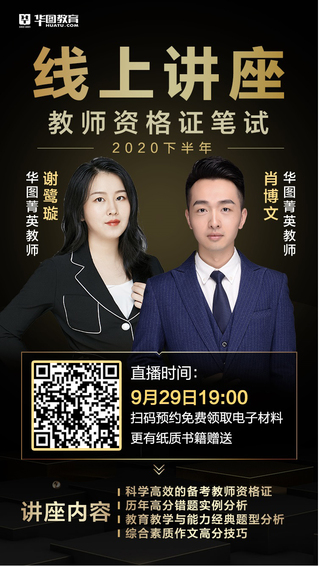时间:2020年9月29日(周二)19:00 参与方式:扫描海报中的二维码 针对群体:备考教师资格证的学生群体 主题要点: 1. 如何科学高效备考 2. 历年高分错题实例分析 3. 教育教学与能力经典题型分析 4. 综合素质作文高分技巧
