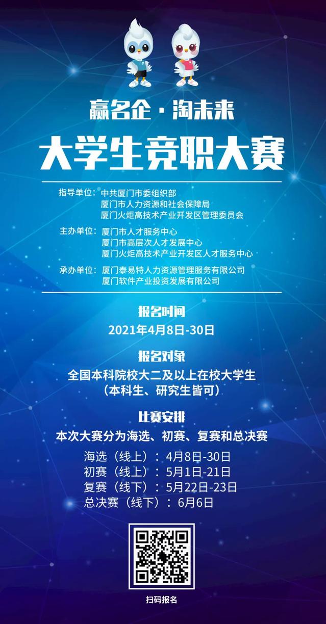 为做好人才人力资源要素保障工作,更好宣传厦门市情和引才政策,营造厦门良好的职场氛围,为大学生提供磨练自我意志、提升综合素质、拓展求职视野、打好职场基础的良好环境,更好地助力大学生来厦高质量求职创业,给企业推送更多优质毕业生,市人才服务中心拟于2021年4-6月举办2021年“赢名企•淘未来”大学生竞职大赛(以下简称大赛),现将有关事项通知如下: