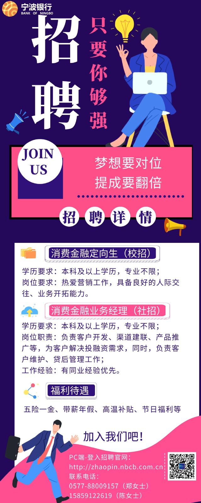 【宁波银行】招聘 消费金融定向生 :专业不限 工作地点:福建(福州、泉州、宁德、三明) 薪资13W+(首年保护) 完善的晋升体系; 健全的福利保障体系; 系统的岗前培训和在职提升培训; 有兴趣可联系:18357876787