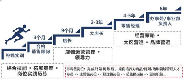 三年内零售终端基层培养,包含:销售精英→店长→大店长(零售主管);