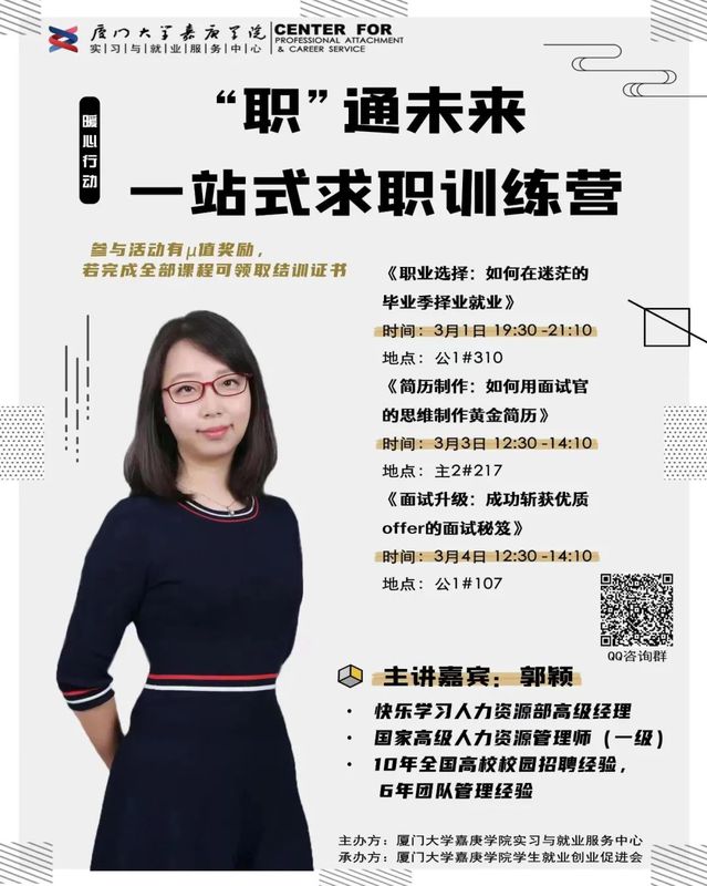 除了为大家提供丰富高质的就业信息外,我们还为大家精心准备了就业能力提升精品活动哦~职业测评、简历优化、面试指导、求职心理、职业决策、创业准备等,充分满足大家的求职准备需求!