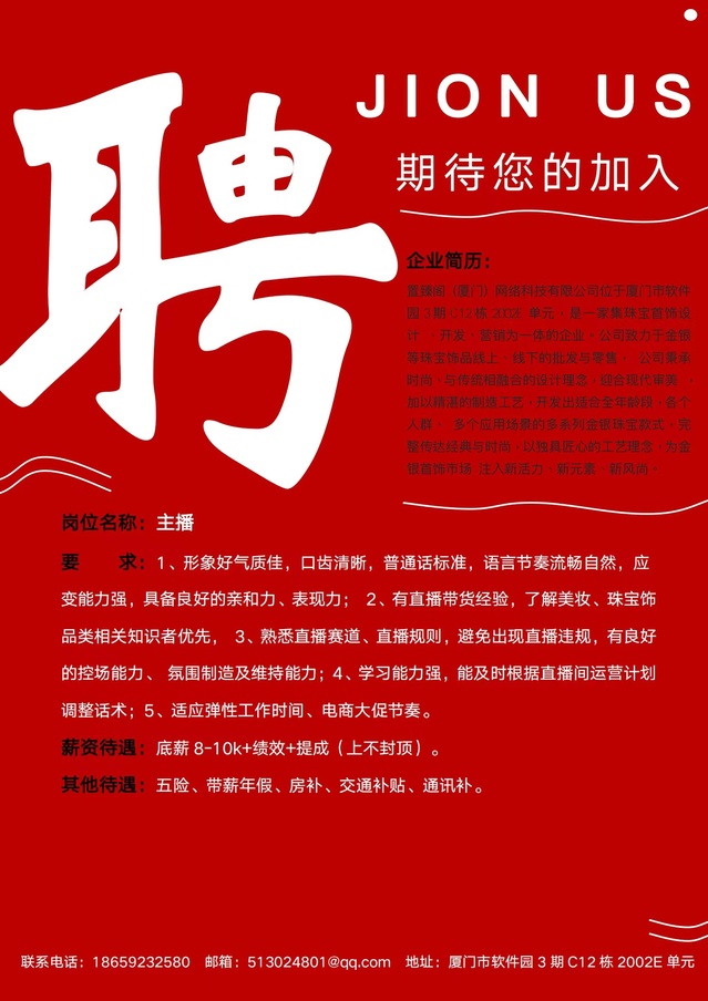 岗位要求:1、形象好气质佳,口齿清晰,语言节奏流畅自然,应变能力强,具备良好的亲和力、表现力; 2、有直播带货经验,了解美妆、珠宝饰品类相关知识者优先, 3、熟悉直播赛道、直播规则,避免出现直播违规,有良好的控场能力、 氛围制造及维持能力;4、学习能力强,能及时根据直播间运营计划调整话术;5、适应弹性工作时间、电商大促节奏。