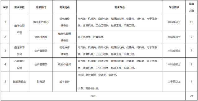 福建鑫叶投资管理集团有限公司(简称“鑫叶公司”)地处厦门,系国有企业,主要负责经营管理多元化投资,涵盖印包、酒店、物流等行业。公司核心业务是印包业,拥有国内先进的印刷设备,可生产从卷烟商标到内包装等一系列烟用材料。为满足鑫叶公司持续健康发展需求,现竭诚邀请您加入鑫叶公司。本次招聘范围为鑫叶公司本级和下属子公司(鑫达彩印公司、石狮富兴公司、鼓浪湾酒店),具体招聘信息如下: