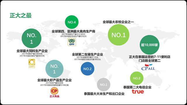 正大集团秉承“利国、利民、利企业”的三利经营宗旨,历经百余年的蓬勃发展,已从经营单一业务的“正大庄种子行”,发展成以农牧食品、批发零售、电信电视三大事业为核心,同时涉足金融、地产、制药、机械加工等 10多个行业和领域的多元化大型跨国集团公司。集团业务遍及全球100多个国家和地区,在全球有员工超过46万人,2024年全球销售额1022亿美元。