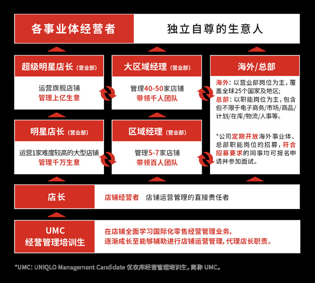 ②全国乃至全球派遣的工作机会:为将UMC培养成合格的经营者,UMC入职后有机会挑战各个城市的工作,在这个过程中,UMC不仅能体验不同城市的人文情怀,还将经历不同店铺的经营模式,开拓眼界,提升生意经营能力。公司定期开放海外事业体招募岗位,符合招募要求的同事亦可以积极申请,挑战更广阔的发展空间。